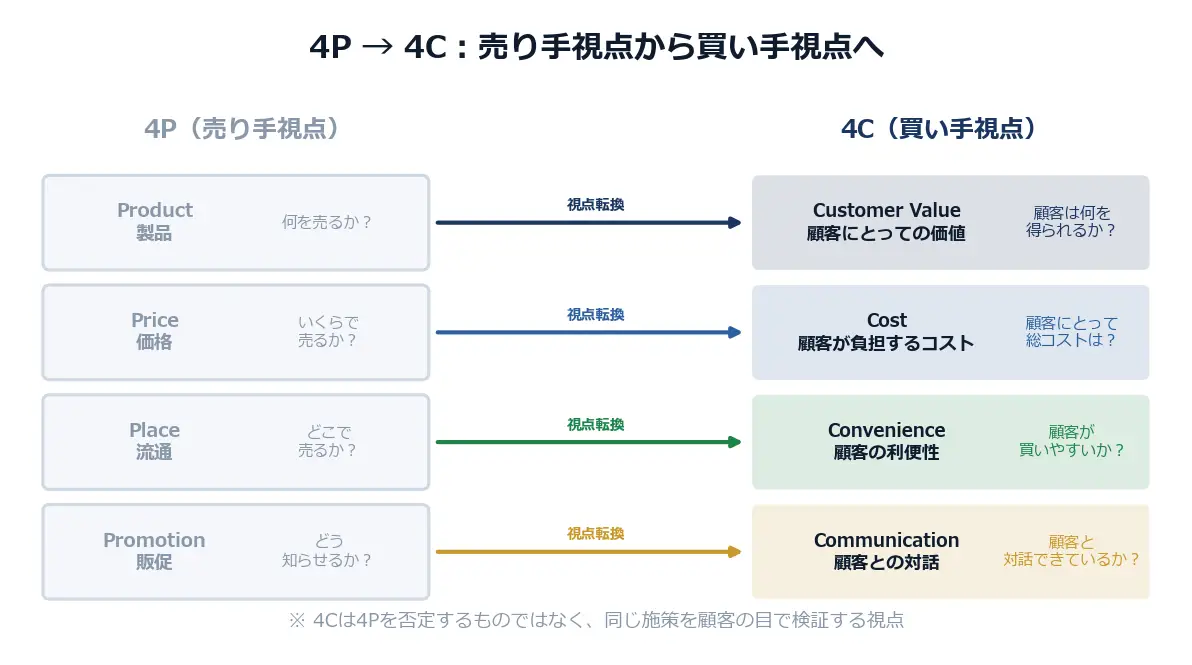 ロバート・ラウターボーンが1990年に提唱しました。4P(売り手視点)に対して、同じ施策を買い手の目で見直すことで、「顧客に届く施策になっているか」を検証できます。