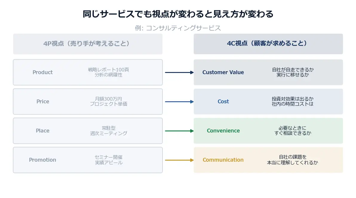 図解3: 4P視点と4C視点の違い ― コンサルティングサービスを例に、同じサービスでも視点が変わると見え方が変わる