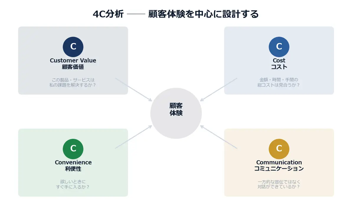 4C分析は、マーケティング施策を「顧客の目」で検証するフレームワークです。Customer Value、Cost、Convenience、Communicationの4つの視点で、「この施策は本当に顧客にとって良いものか」を問い直す。4Pで設計し、4Cで検証する。この往復が、施策の精度を高めます。