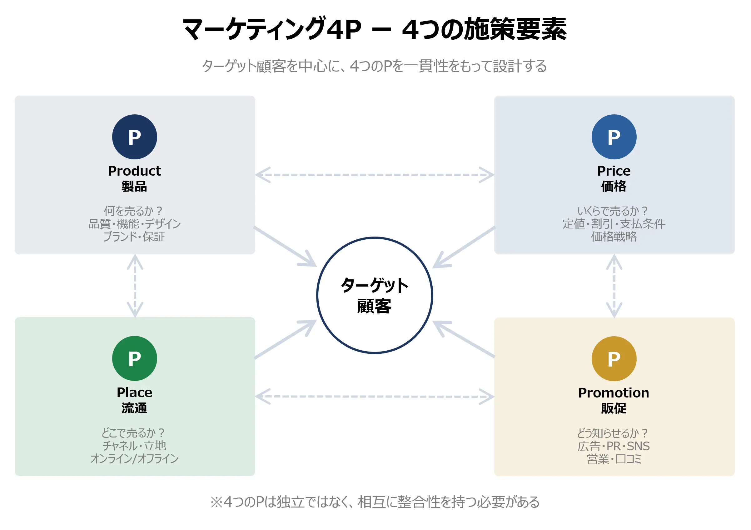 4つのPは独立した要素ではなく、互いに整合性を持つ必要があります。高級ブランド品(Product)をディスカウントストア(Place)で半額セール(Price)で売れば、ブランド価値は毀損します。4Pの一貫性こそが、マーケティングミックスの核心です。