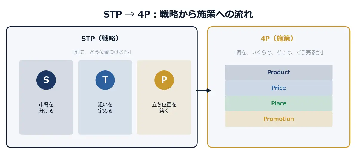 図解2: STPから4Pへの流れ ― 戦略で「誰に、どう位置づけるか」を決め、施策で「何を、いくらで、どこで、どう売るか」に落とし込む