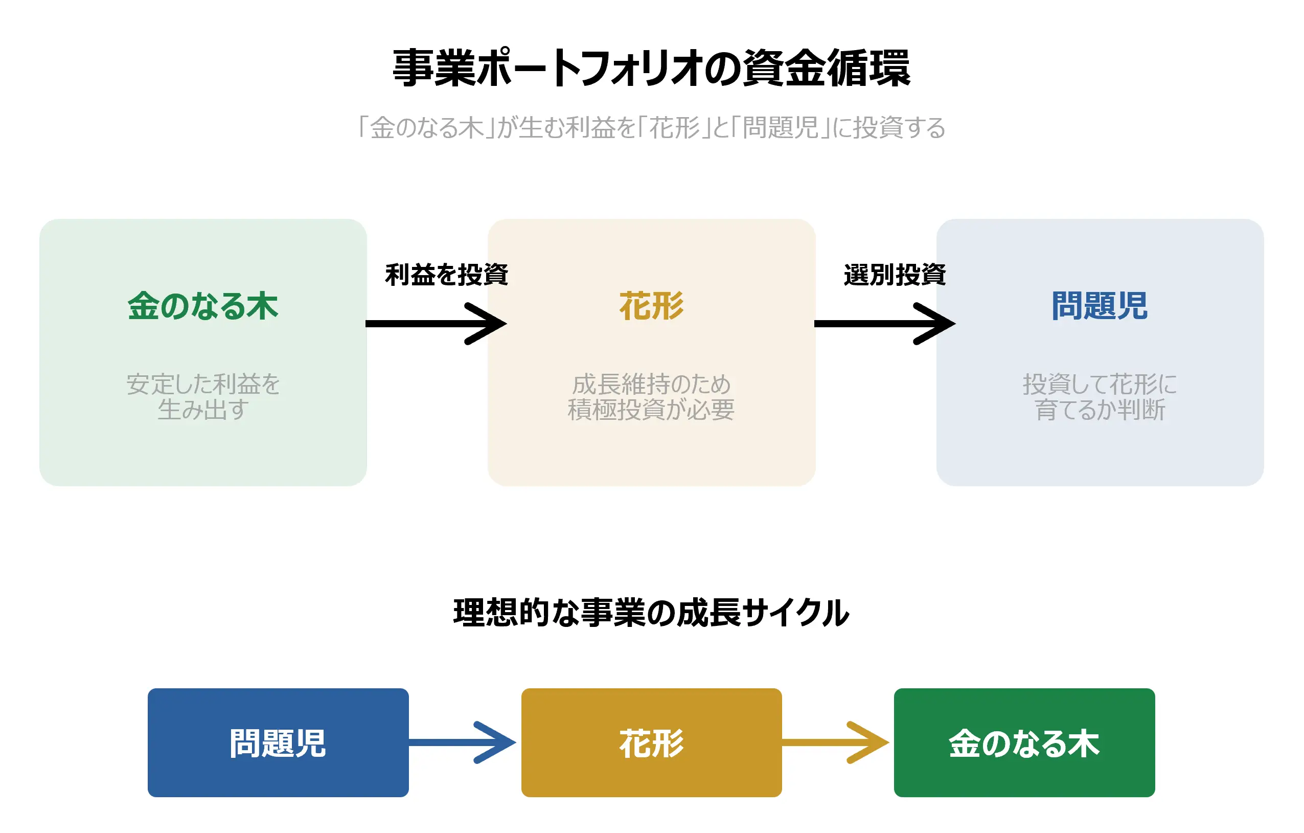 図解2: 事業ポートフォリオの資金循環 ― 金のなる木が生む利益を花形と問題児に投資し、問題児→花形→金のなる木と成長させる