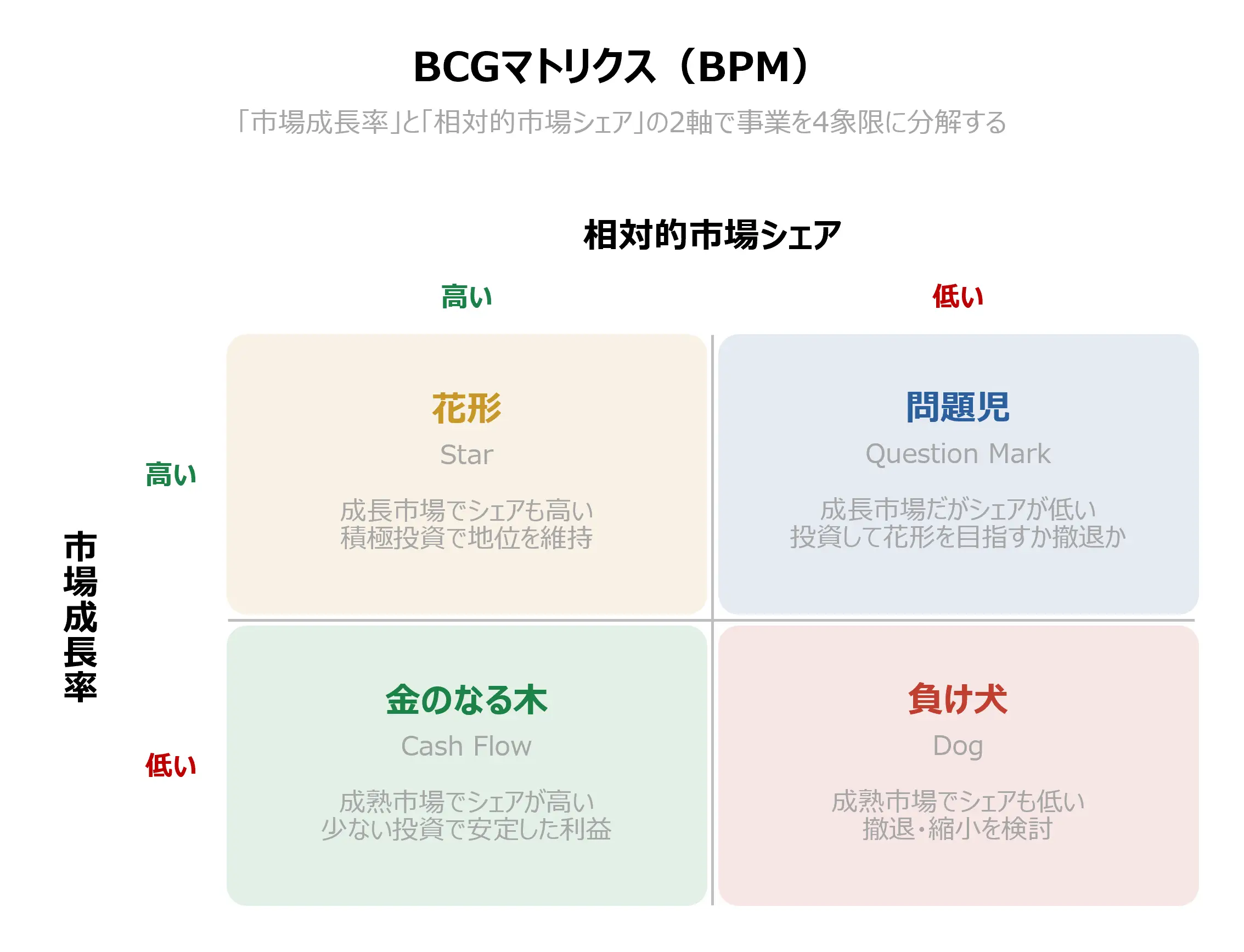 1970年代にボストン・コンサルティング・グループのブルース・ヘンダーソンが開発しました。複数事業を持つ企業が「どの事業に投資し、どの事業から撤退するか」を視覚的に整理できるのが最大の特徴です。