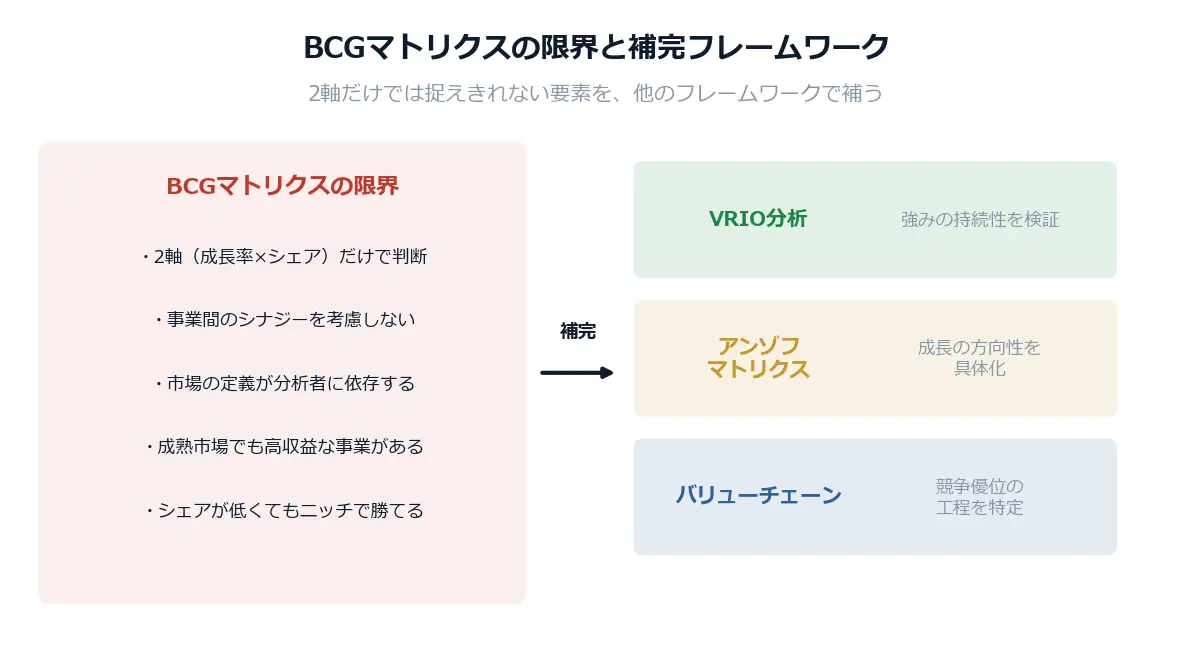 図解3: BCGマトリクスの限界と補完フレームワーク ― VRIO・アンゾフ・バリューチェーンで多角的に分析する