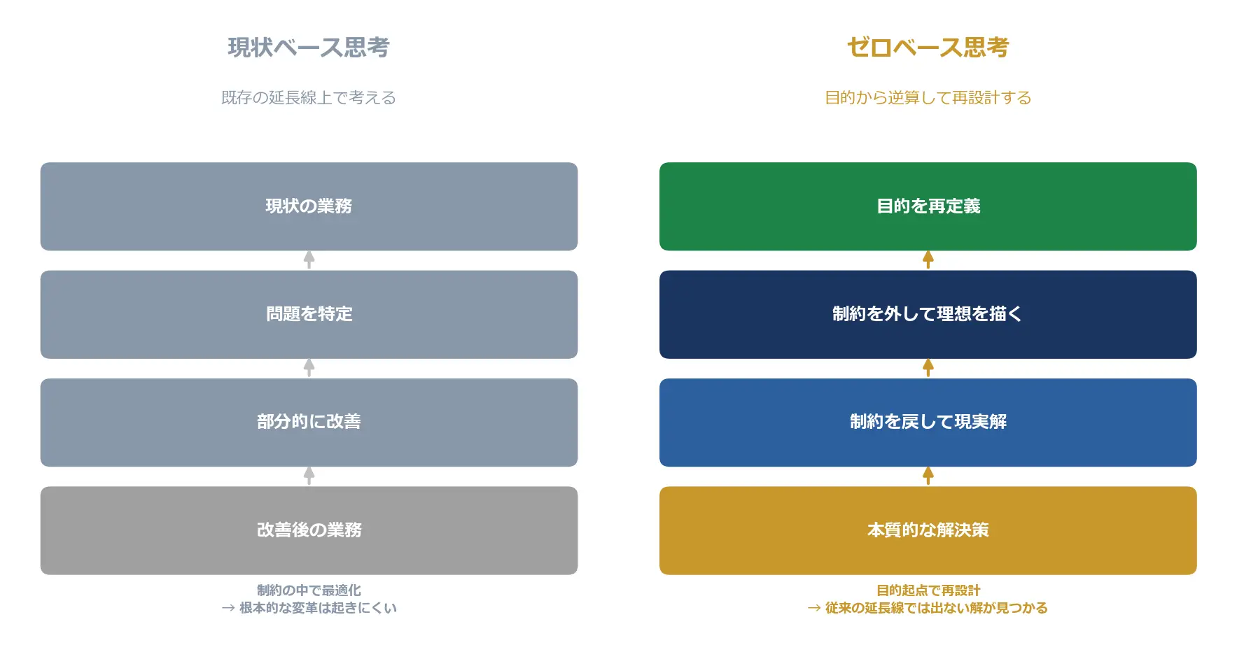 図解1: 現状ベース思考 vs ゼロベース思考 ― 既存の延長線で考えるか、目的から逆算するか