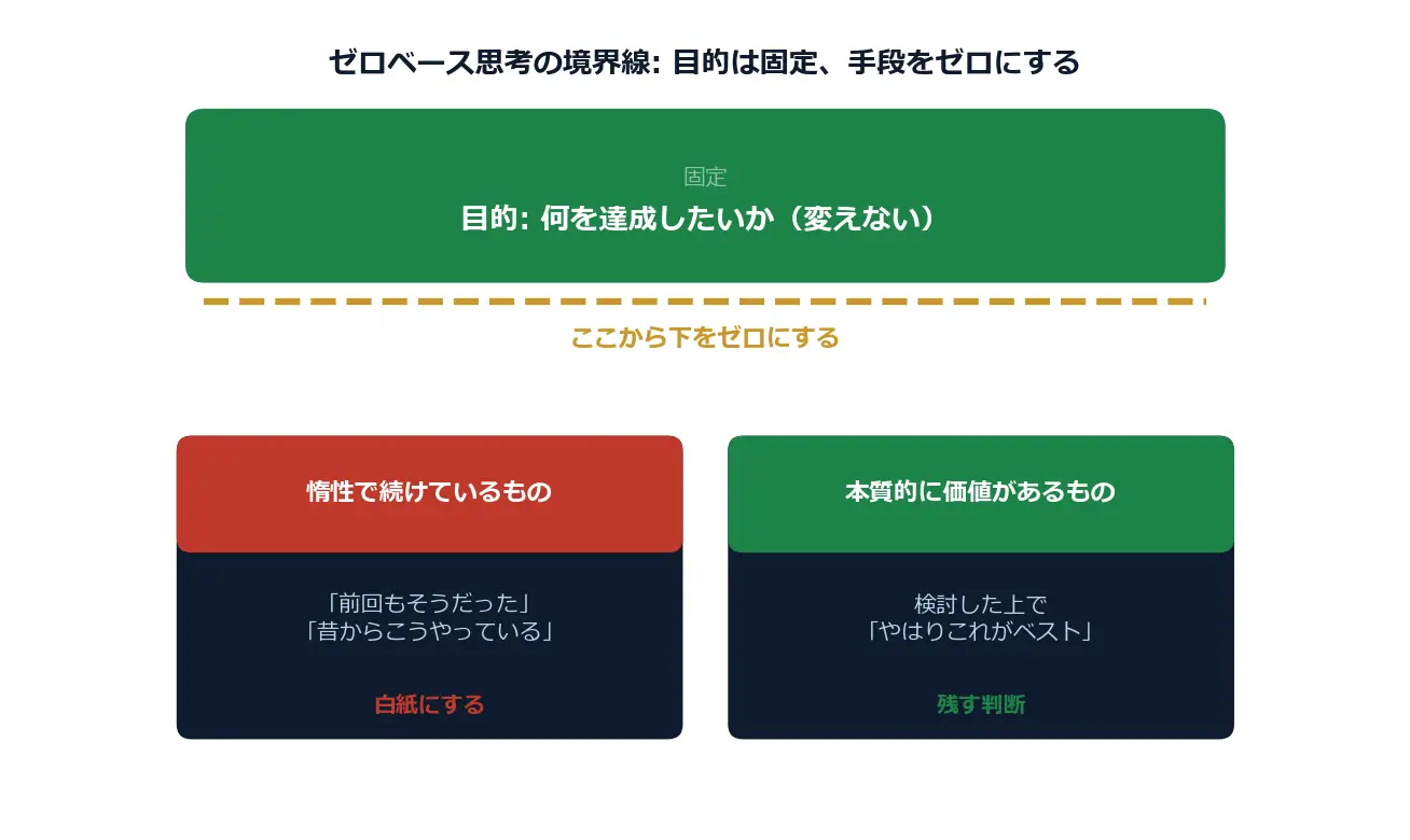 図解3: ゼロベース思考の境界線 ― 目的は固定し、手段を白紙にする