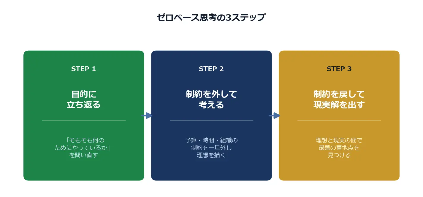図解2: ゼロベース思考の3ステップ ― 目的に立ち返る→制約を外す→制約を戻して現実解