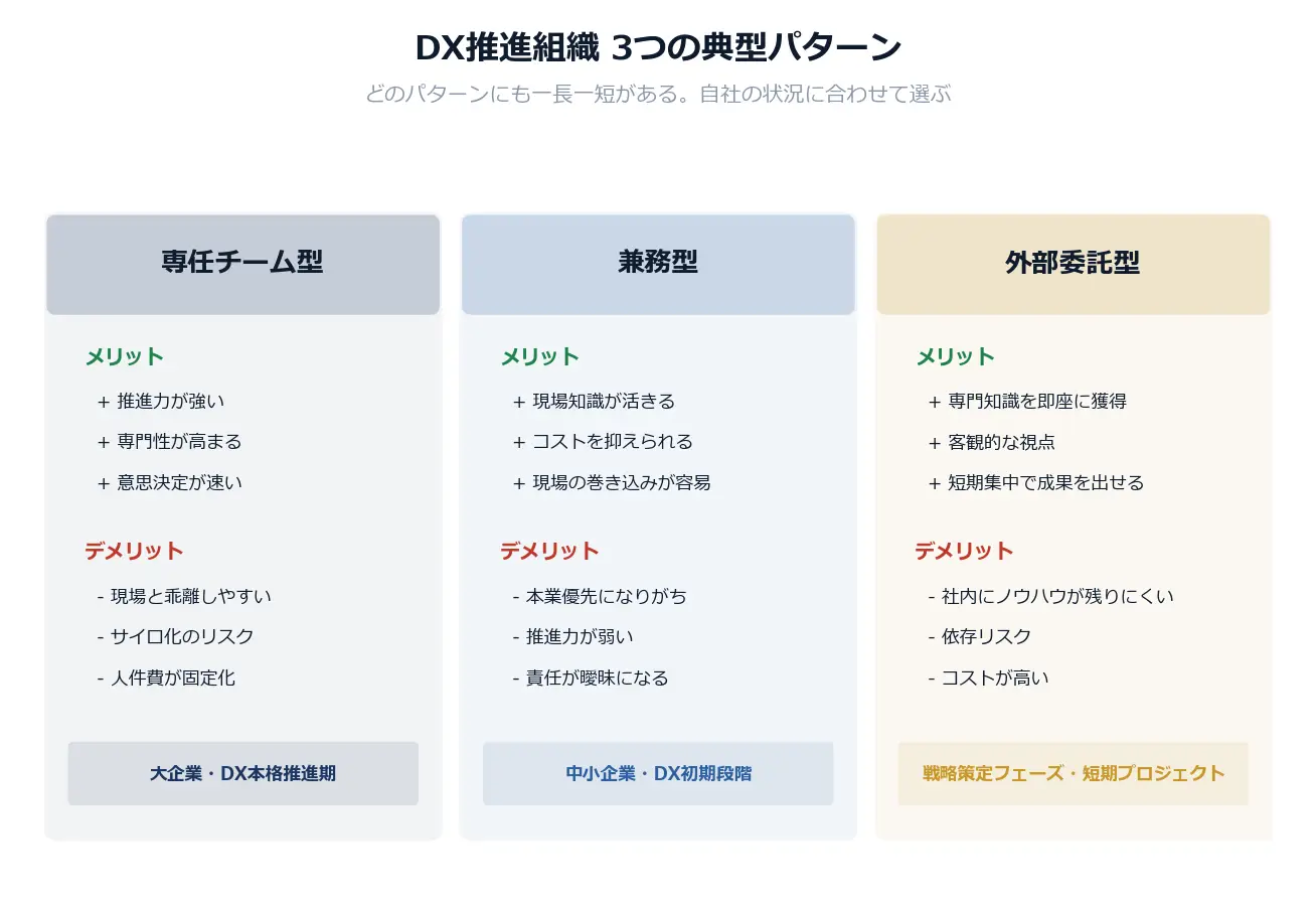 日本企業のDX推進組織は、大きく3つのパターンに分類できます。どれが正解ということではなく、それぞれに一長一短があります。