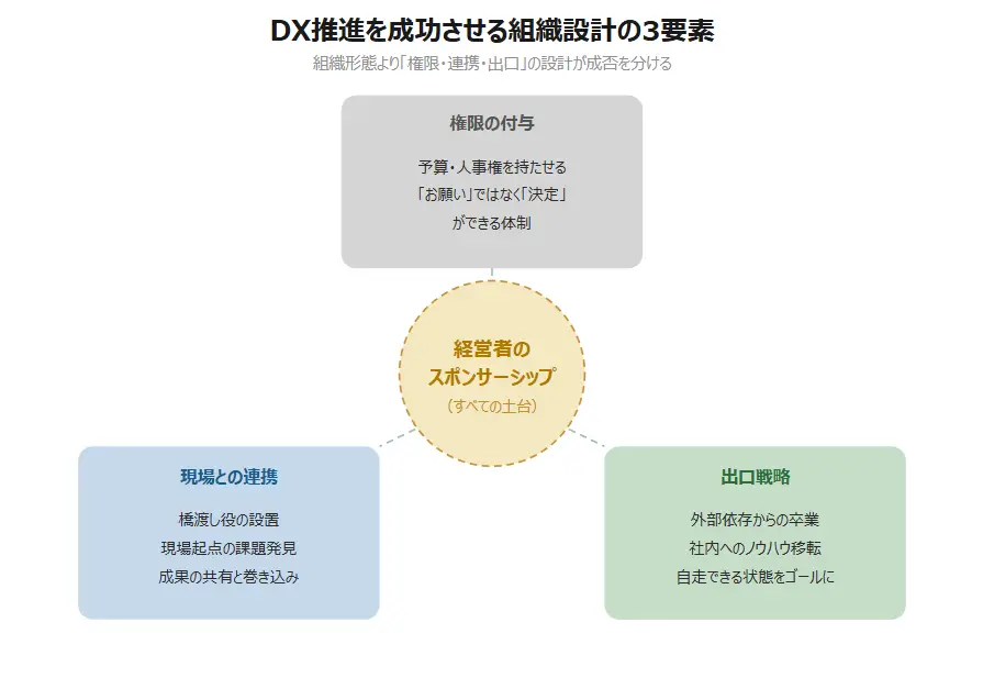 組織形態(専任か、兼務か、外部か)は、自社の規模やDXの成熟度に応じて選べばよい。大切なのは形ではなく、「権限」「連携」「出口」の3つが設計されているかどうかです。