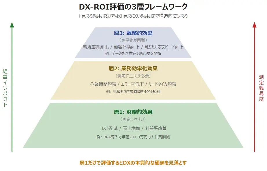 図解1: DX-ROI評価の3層フレームワーク ― 「見える効果」だけでなく「見えにくい効果」まで構造的に捉える