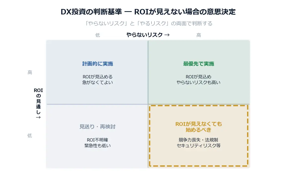 図解2: DX投資の判断基準 ― 「やらないリスク」が高い領域は、ROIが見えなくても始めるべき