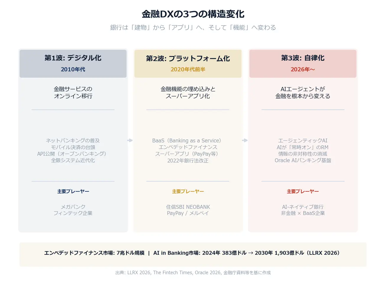 図解1: 金融DXの3つの構造変化 ― デジタル化・プラットフォーム化・自律化の3段階で進化する(出典: LLRX 2026, Oracle 2026, 金融庁資料等を基に作成)