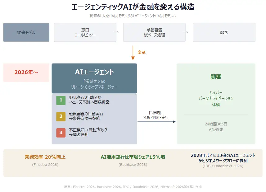 図解2: エージェンティックAIが金融を変える構造 ― 従来の人間中心モデルからAI自律モデルへ(出典: Finastra 2026, Backbase 2026, IDC / Databricks 2026等を基に作成)