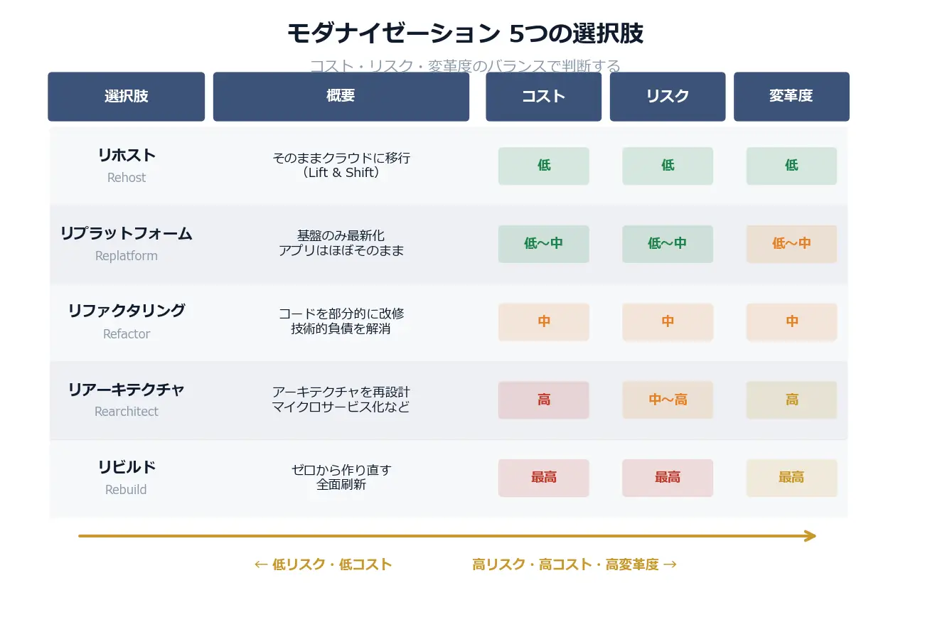 図解1: モダナイゼーション5つの選択肢 ― コスト・リスク・変革度のバランスで選ぶ