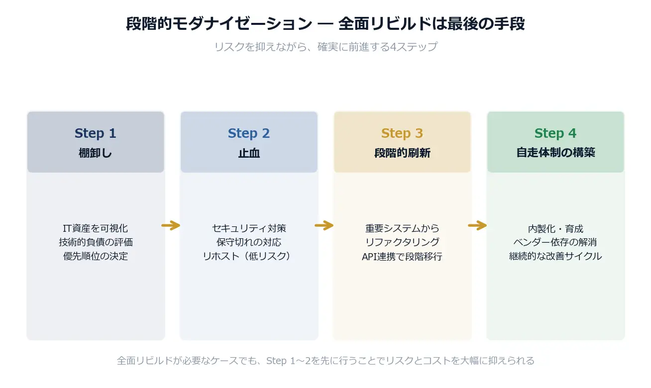 図解2: 段階的モダナイゼーション ― 全面リビルドは最後の手段。確実に前進する4ステップ