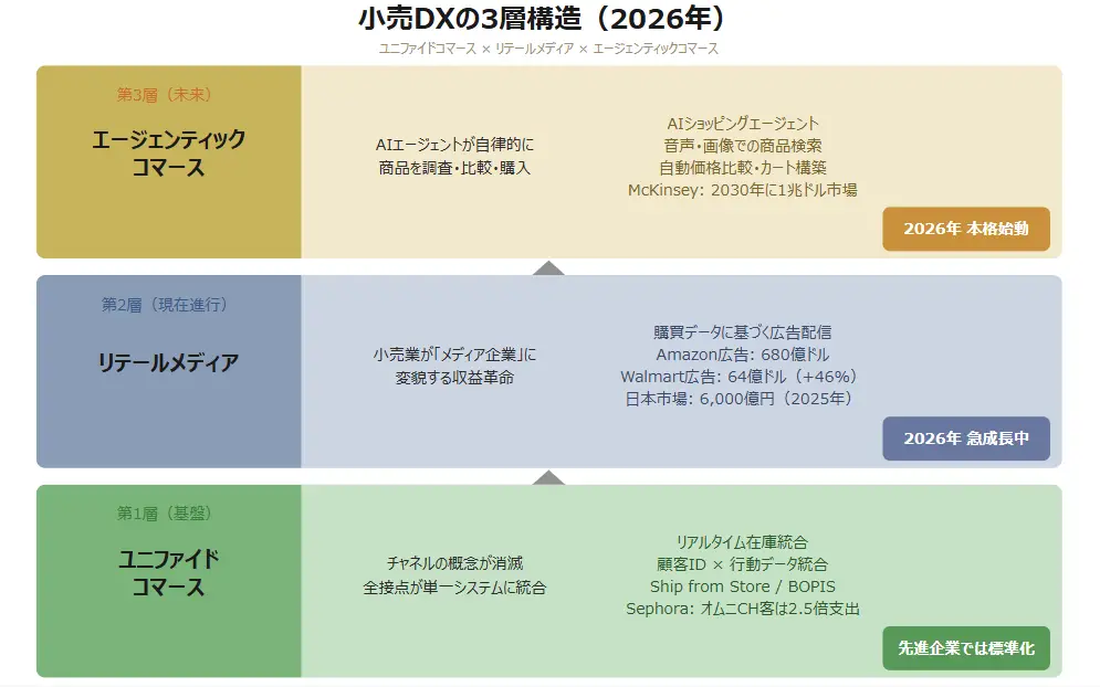 図解1: 小売DXの3層構造(2026年版)― ユニファイドコマースを基盤に、リテールメディアとエージェンティックコマースが新たな競争軸を作る(出典: Shopify 2026, McKinsey 2025, CARTA HOLDINGS 2022, ALM Corp 2026 等を基に作成)