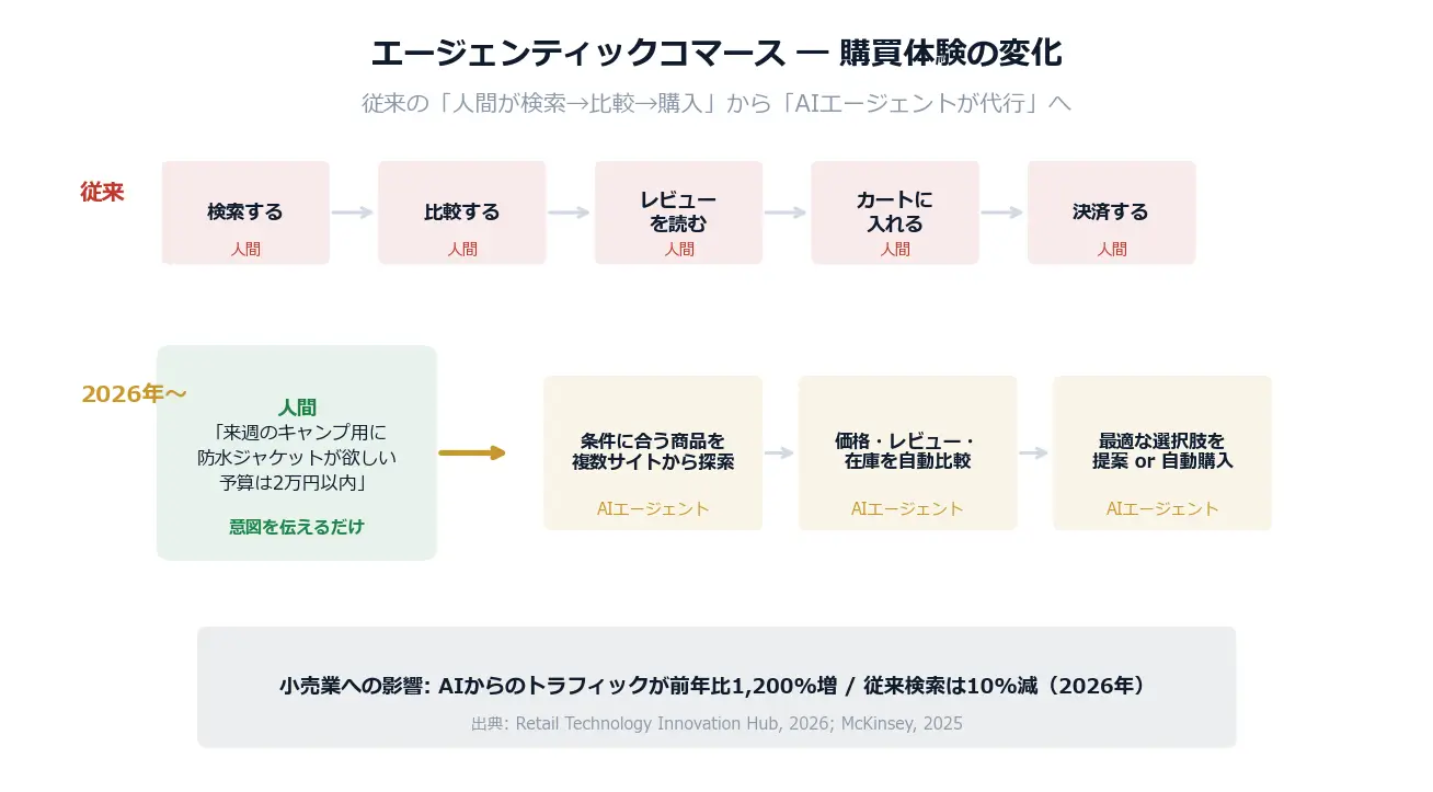 図解2: エージェンティックコマースの購買フロー ― 従来の「人間が5ステップで購買」から「意図を伝えるだけでAIが代行」へ(出典: McKinsey 2025, Google Cloud Blog 2026, Modern Retail 2026 等を基に作成)